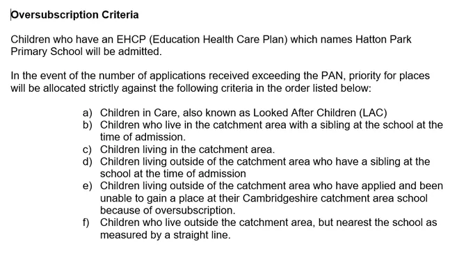 As laid out the the Cambridgeshire's First Steps booklet, places are allocated at Hatton Park according to these criteria. Please be aware that our Pupil Admission Number (PAN) is still currently 60.